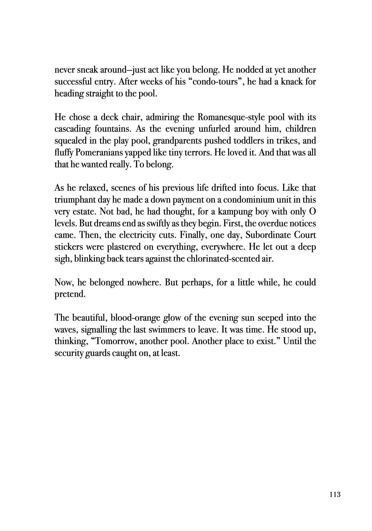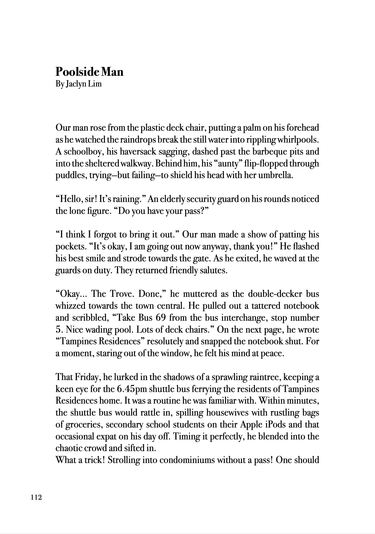I contributed via an open call for stories. My short story, Poolside Man, was included in this anthology. Set in Tampines, it tells the story of an unnamed protagonist who slips into condominium pools, exploring personal loss and a yearning for belonging.